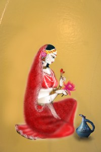 Next, the particulars of Śrī Guṇa Mañjarī are given: In the northeastern part of Śrī Campakalatā’s kuñja lies the beautiful Guṇānandaprada Kuñja, where Śrī Guṇa Mañjarī always resides. Her complexion is bright like lightning, and she wears a fine silk dress the color of a red jabā flower. She is famous for her strong desire to make Rūpa Mañjarī happy. She is three days younger than Śrī Tulasī (Rati Mañjarī) and is the delight of Śrī Kṛṣṇa. She is described as being dakṣiṇā-prakharā in nature. Her age is 13 years, 1 month and 27 days. In gaura-līlā she is known as Śrī Gopāla Bhaṭṭa Gosvāmī.